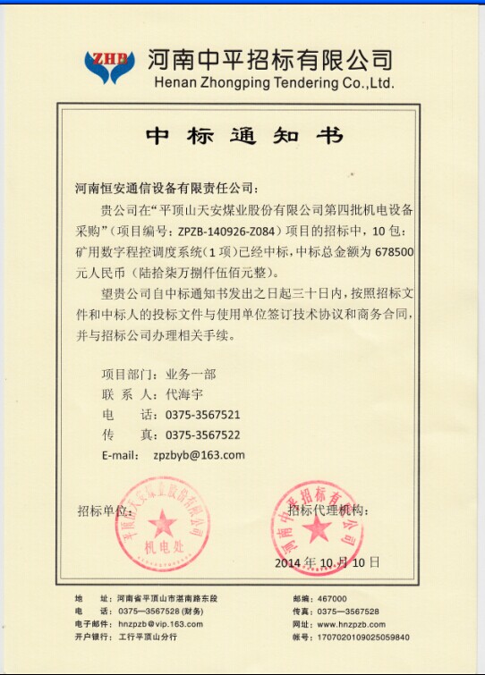 熱烈祝賀我公司KTJ119礦用數字程控調度系統在“平頂山天安煤業股份有限公司第四批機電設備采購 ”招標活動中中標