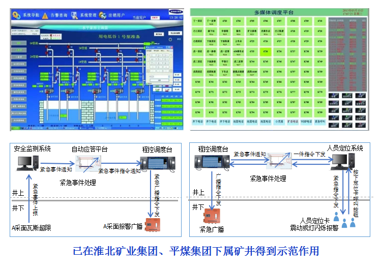 基于數字程控電話的煤礦多網融合集中調度指揮系統,采用程控調度系統的觸摸屏鍵盤作為操作終端,調度人員操作熟練,使用頻率高,并且調度通信系統具有地面供電、覆蓋范圍廣、操作簡便、穩定可靠、組網和擴展能力強,部署靈活等優點,可以最大化利用現有資源進行集成和整合,將煤礦現用的程控調度系統、無線通信系統、擴播通信系統、廣播系統等接入系統,實現各系統的互聯互通,同時還能與人員定位、安全監測及自動化系統進行語音聯動,實現瓦斯超限、設備啟停、故障等的自動廣播告警、與自動化控制平臺雙向通話等功能。有效的提高了調度指揮水平和應急處理能力,全面提升煤礦安全保障能力。